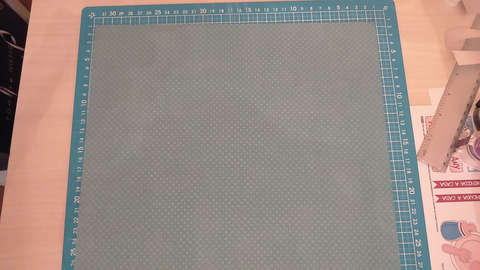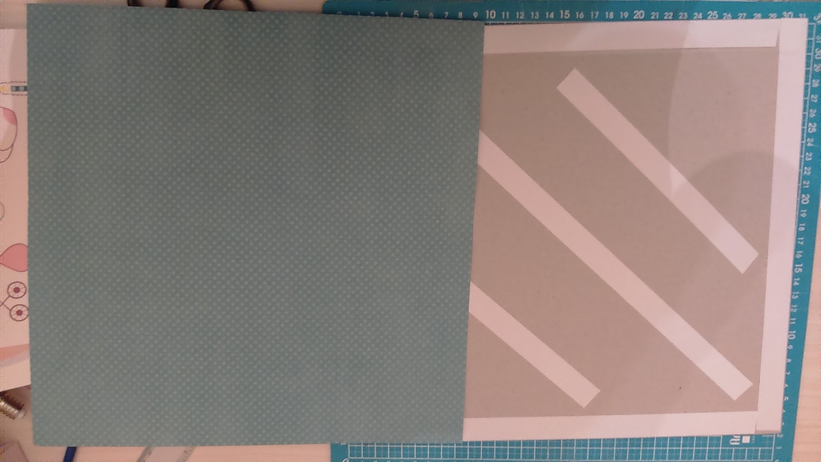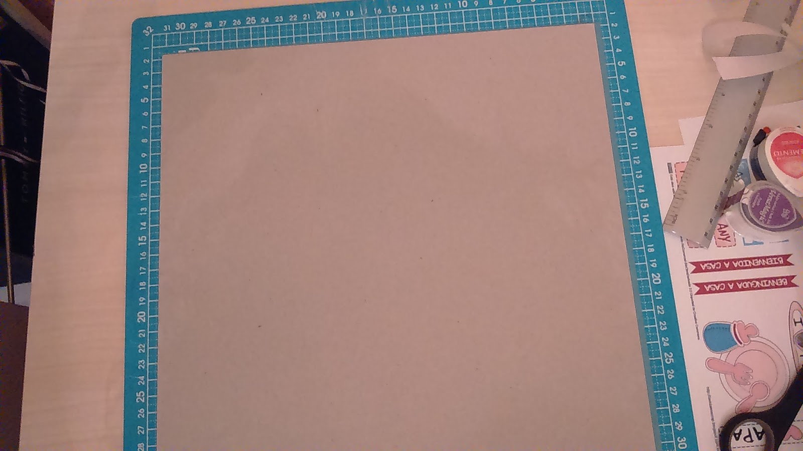 de scrap de color turquesa para la base, letras de madera,imágenes impresas infantiles, wuasitape, tijeras, regla,cutter, y doble cara. |